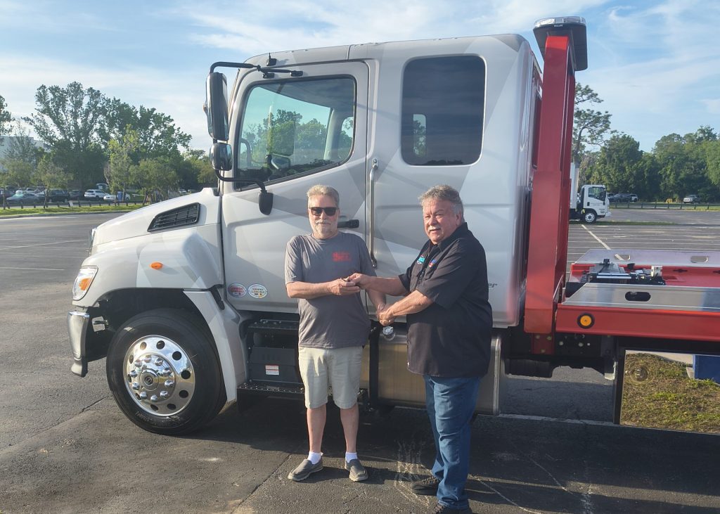 Jon Redman, left, of Northern Neck Auto Parts (King George, VA) and Redman Fleet Services (Alexandria, VA) accepts the keys for the 2026 Florida Tow Show® raffle truck from PWOF Board Member Frank Ennis.